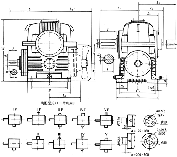 TPG80、TPG100、通用型包絡(luò)蝸桿減速機形式及外形尺寸(Ⅳ—Ⅵ)